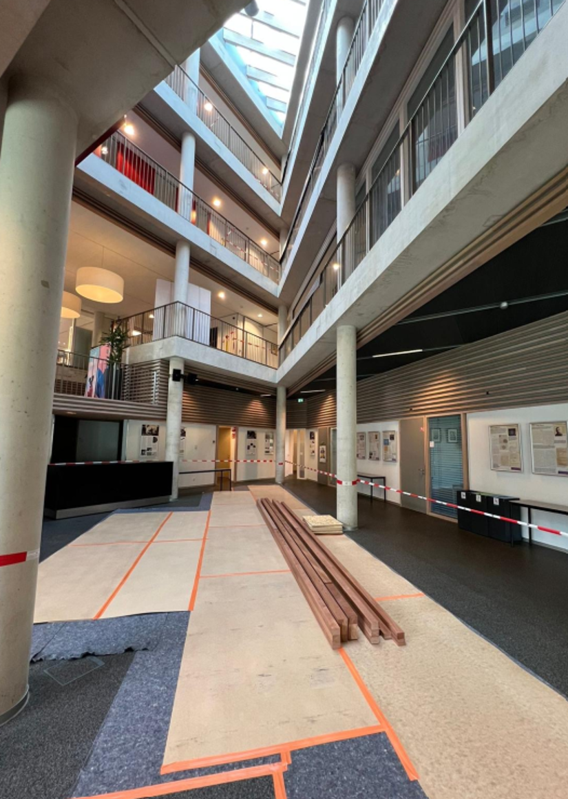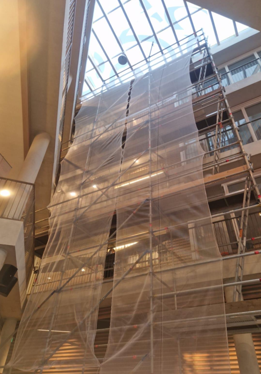Het project kende zijn uitdagingen. “Alles moest in het weekend gebeuren, omdat het gebouw doordeweeks vol in gebruik is,” legt Marco uit. “Bovendien waren we afhankelijk van andere partijen voor montage en afbouw. De locatie, in een smal atrium van vier verdiepingen, maakte het extra complex.” Lex vult aan: “Het eindresultaat mag er wezen, het is uiteindelijk echt mooi geworden."
